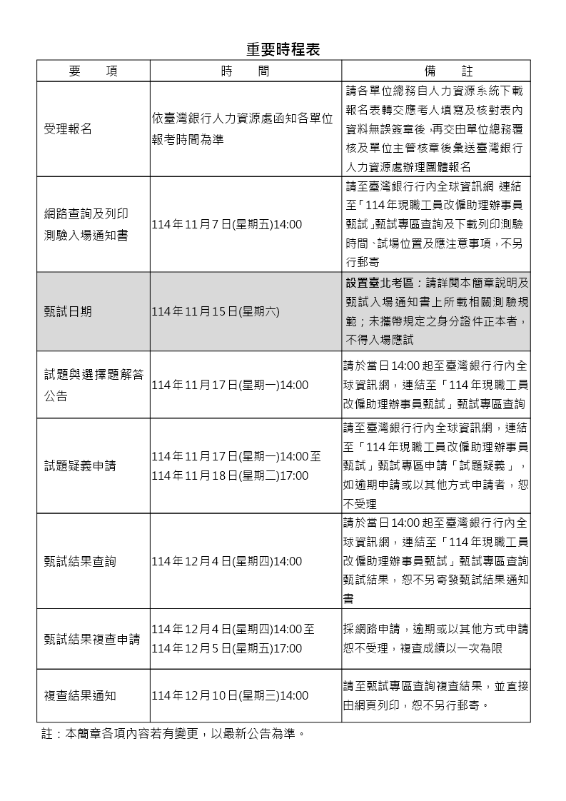 臺灣銀行114年現職工員改僱助理辦事員甄試