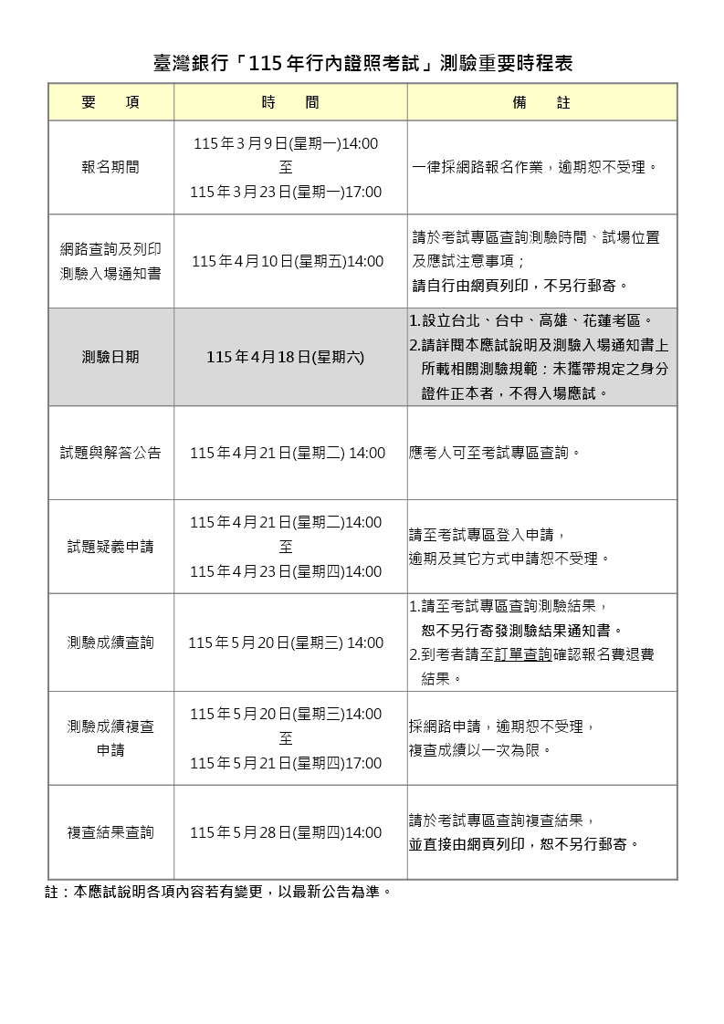臺灣銀行「115年行內證照考試」測驗